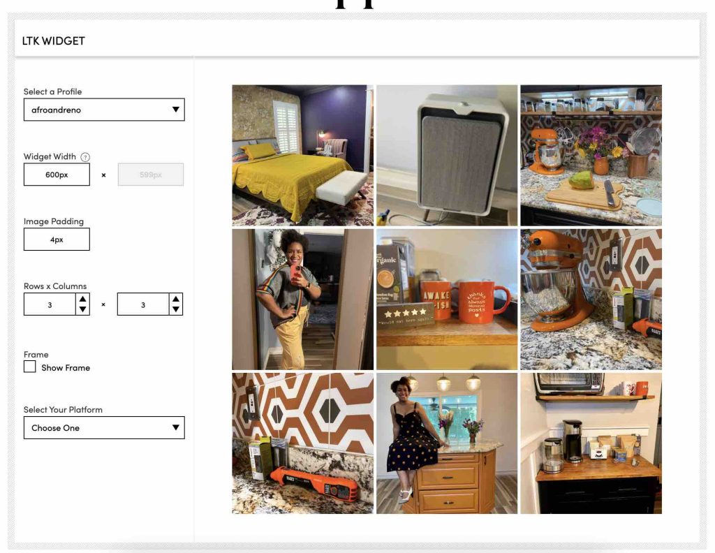 There are lots of ways to display your favorite products from LTK on your website! You can generate a widget… all you need is a WordPress website, the ability to install plugins and a creator account on LTK! The best part is that it Auto Updates! You never have to touch the widget again to show your latest finds!