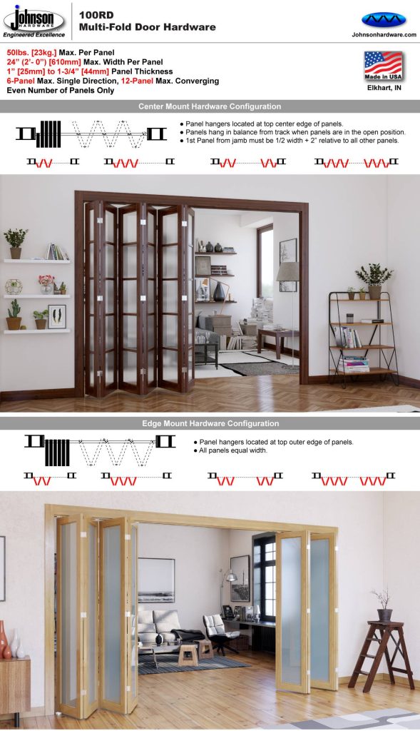 The small wall in-between!! I would like to remove that wall and make it one big opening! That is one of the first phases of the project. Now, you may go “that wall is there so the closet doors have something to attach to”. You’d be right! The next part of this revamp is to changes the closet door hardware to allow multifold doors. There are a couple configurations to choose from.