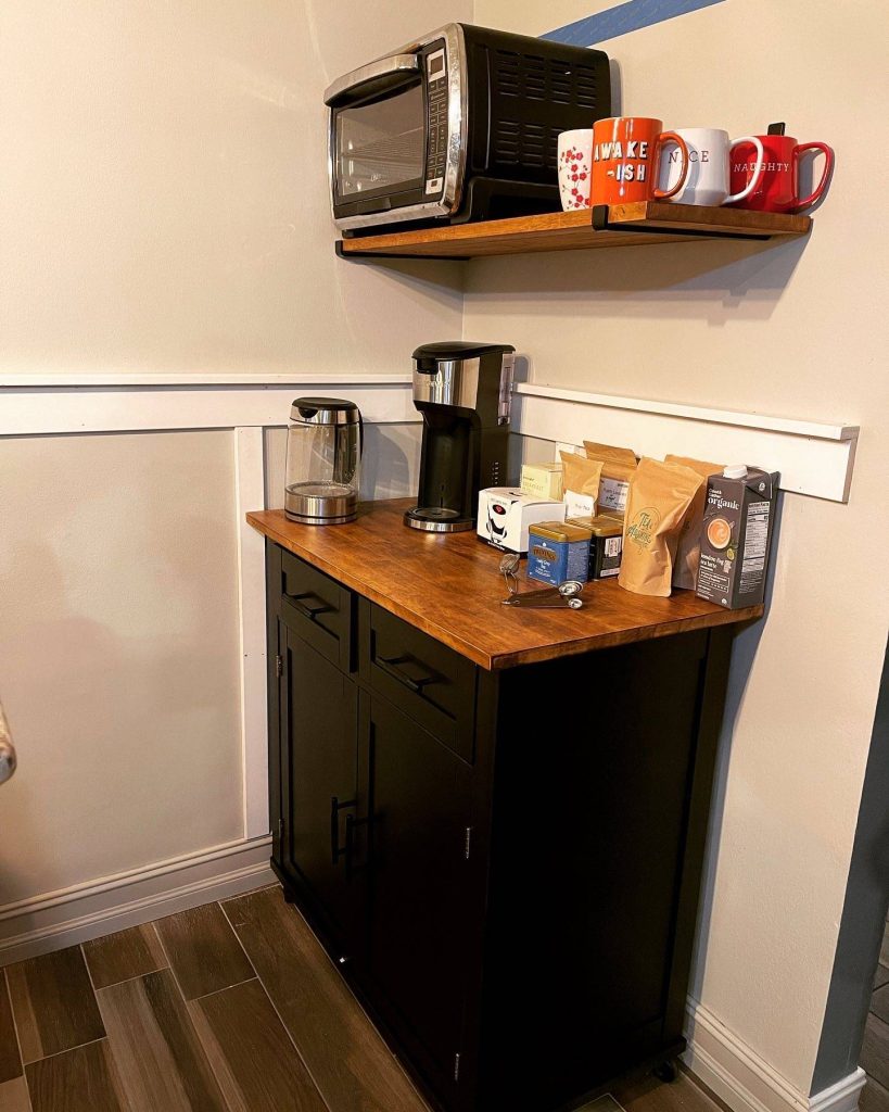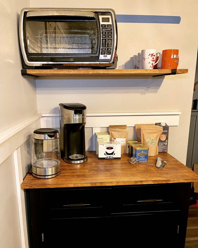Underneath the shelves will be the actual bar. The bar will hold my coffee make, a tea kettle and give me a bit of space to make my drinks.