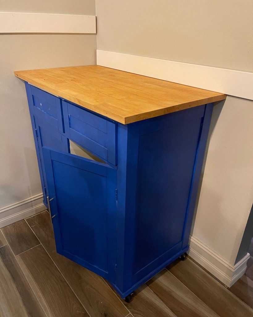 I got the cart on clearance at target about 5 years ago. In my old townhome I used it as an island. The original color was whites and I added a wax to seal the counter top. Fast forward to now. That wax SUCKS!!!! It made the counter top yellow, and it did not really help in sealing. Removing the wax topcoat was also the worst…took several sheets of sandpaper to come off. Priming it was essential because even the blue wasn’t sticking properly, this was before I knew that melamine finishes need a good sanding/primer. You live and you learn.