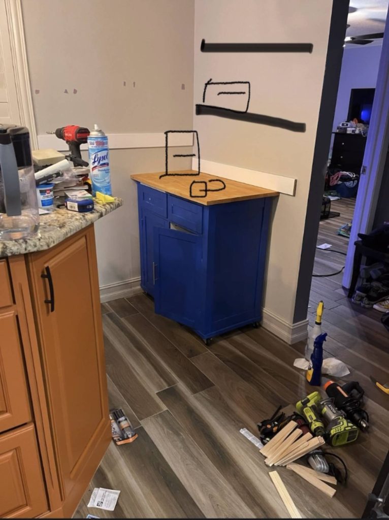 So what did I accomplish on the Coffee bar area! A lot! I finally finished the board and batten…It is not 100 percent finished but the structure is there. Look out for a week 9 update lol. I also added one shelf, with tape in the spot where the second will go. The shelf is the extension that used to be part of the cart. It folded down to be out of the way. Since it was no longer going to be used as an island, I removed it and it just so happened to be perfect for this shelf, no adjustment needed. It has been 2 years since I sold the townhouse, so its been a while!